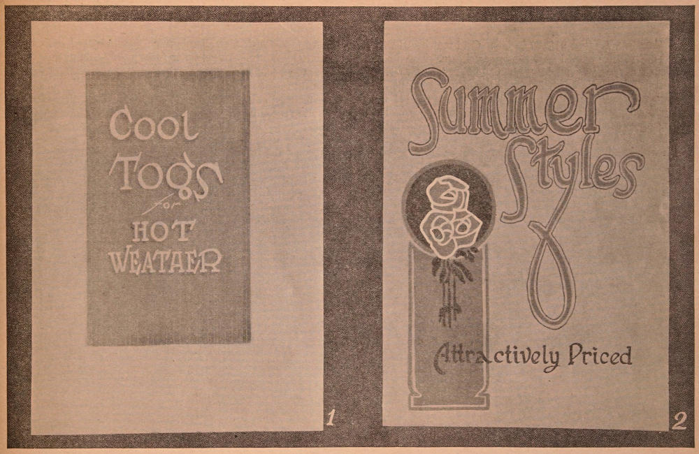 Card No. 1. Size 16×22 inches. Made of white cardboard with air-brushed panel in light blue and panel is striped with faint white lines. You will note that the lines are heavier at the top and bottom, apparently “fading out” toward the center. This produces a very cool, elusive effect, suggesting water. The lettering is done in white color with slight air brush shading in light green. For suggested coolness the colors here used are uniquely effective.