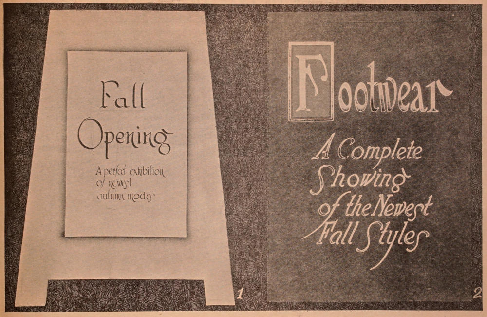 Card No. 2. Size 16×22 inches. Dark green mottled mat board. Initial letter in “Footwear” was done in white color against a bright red background, with border in gold. Balance of letters in word “Footwear” were done in white.