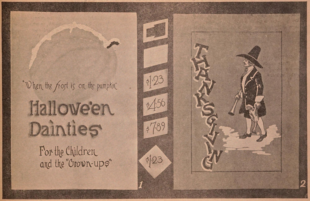 The small line of lettering was done with a No. 3 model “C” Speed Ball pen. The words “Hallowe’en Dainties” were lettered in “Egyptian” with a No. 12 brush, and the color was dark red.