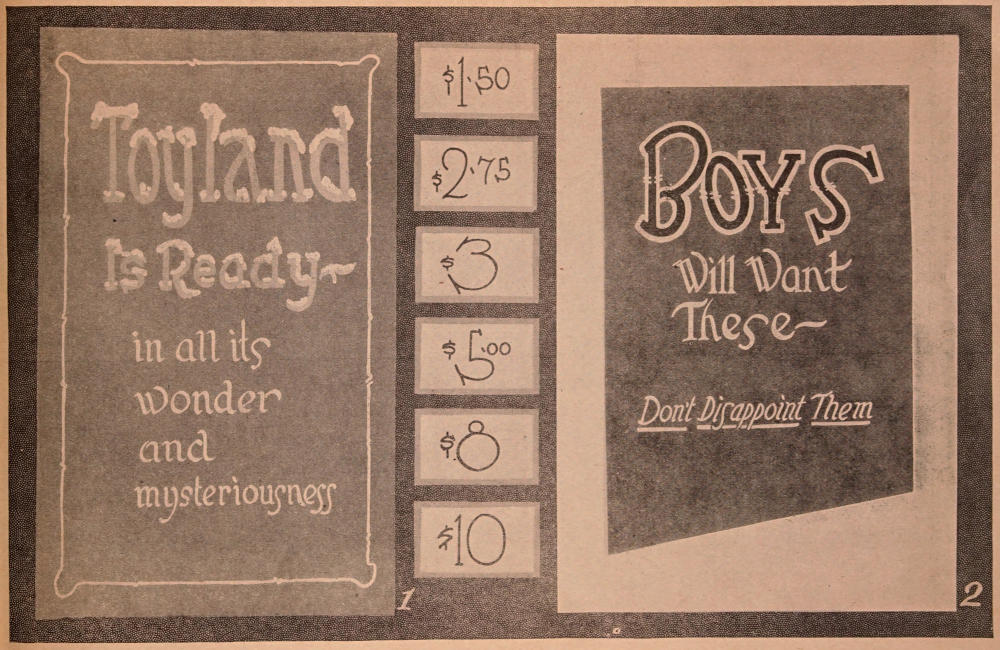 Card No. 1. Size 14×22 inches. Deep blue cardboard stock with border line in white. The words “Toyland is Ready” were done in bright green color. White color was then applied freely and with careless effect at the top of the white letters and also in the bottom curves and spurs. While the white color was quite wet ground glass or “mica” was sprinkled into it, thus producing the effect of snow. The balance of the lettering was done with the brush in bright yellow color.