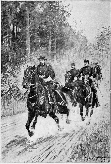 Galloping back, I made my report. “Pick out fifty of the best-mounted men from the escort,” was the response. Riding down the column, with the aid of one of the officers of the regiment, this was soon accomplished, and I reported with the selected men. Turning to his chief of staff, Colonel J. W. Forsyth, the General said something regarding certain instructions he had evidently been giving him, and then said to me, “You and Captain O’Keeffe will go with me;” and nodding good-bye to the other gentlemen of our party, with whom he had probably been conferring while I was making up the cavalry detail, he turned his horse’s head southward, tightening the reins of his bridle, and with a slight touch of the spur he dashed up the turnpike and was off. A yard in rear, and side by[168] side, Captain O’Keeffe and myself swept after him, while the escort, breaking from a trot to a gallop, came thundering on behind.