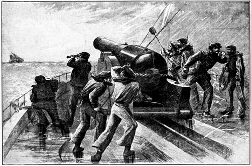 But when the man came with the Great Diorama of the War we learned something new. A diorama is, to be Hibernian, just like a panorama, only it is different. In a panorama you see pictures; in a diorama you see moving figures cut out in profile. After each scene the curtain must be lowered and the stage reset. I remember that this man (I wish I knew his name) began his entertainment with an ordinary series of panoramic views, after which the curtain fell, and we prepared ourselves for the new revelation. When the curtain rose again, we saw a miniature stage set with scenic waters. In the background were two large ships, cut out in profile, and in the distance were two or[11] three more. The next moment we were startled by seeing a flash shoot out from the side of one, followed by a dull boom. Then the other big ship fired, and next the forts, which were at the sides, opened up. We began to tingle with excitement, and could hardly remain in our seats.