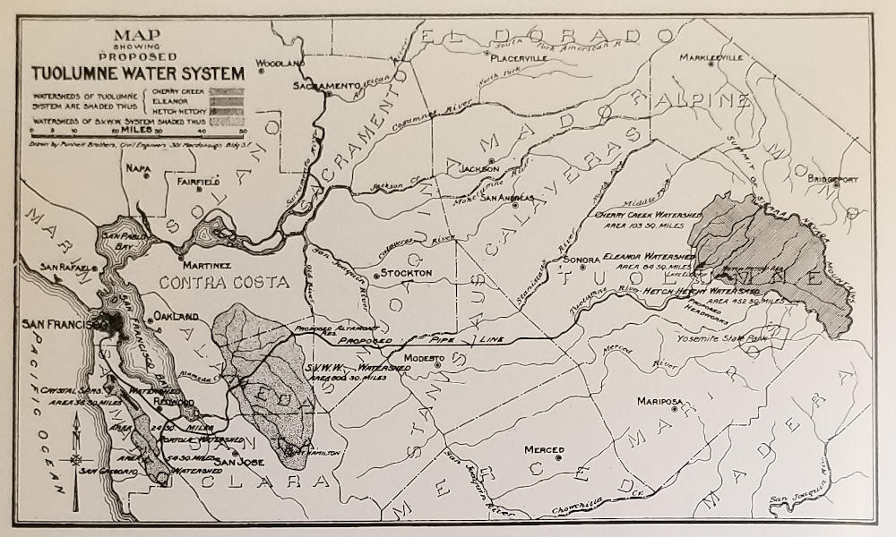 “It has the drawback of distance to overcome, requiring the constructing of conduits aggregating 142 miles in length. But considering the partial and rapid rate of pollution to which all other sources may in the future be subjected, particularly nearby sources, the Tuolumne River is far superior to any other.”