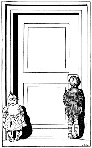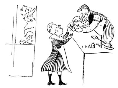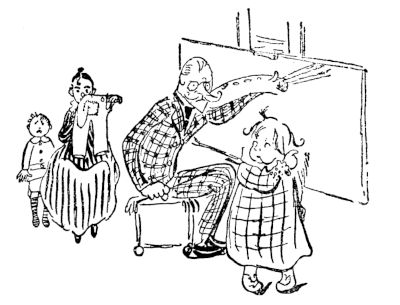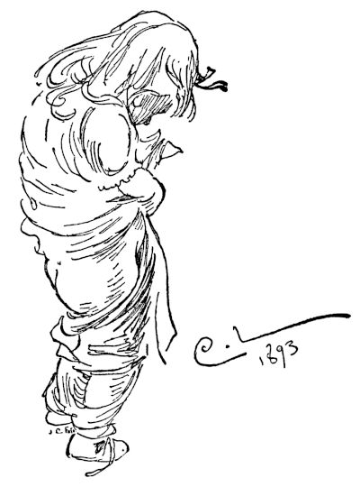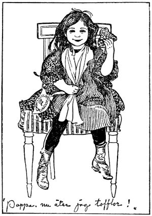 Allerdings. Doch laßt mich jetzt, bevor ich diese Zeilen schließe, auch noch ein paar ernste Worte hinzufügen. Daß diese Bilder mit Motiven aus meinem Heim in die Welt verstreut werden, macht wenigstens mich selbst froh. Es liegt darin etwas von dem „Hinausgehen und allen Völkern predigen“. Worüber? Über das Glück des Fünfzigjährigen? Glück? Ganzes Glück gibt es nicht! Der Schuh drückt stets irgendwo, und das ebenso gut bei denen, die viele Schuhe besitzen als bei denen, welche gar keine haben. Aber die Kinder — und von ihnen handelt eigentlich dieses Buch — sind die Träger unserer Hoffnungen und unserer Sehnsucht. Diese sind ebenso wie Du und ich tot geboren. Und doch: ihre rosigen Wangen und dicken krummen Beinchen, ihr fröhliches Geplapper, ihre bitteren Puppen- und Schularbeitssorgen, ihre verdrehte Ausdrucksweise, ihr Appetit, all’, all’ dieses erregt unser Entzücken, wir lachen, bis uns die Tränen an den von des Lebens Sorge durchfurchten Wangen herunterrollen, und wir drücken sie fast tot, diese Kleinen und danken Gott, daß er sie uns gab, denn wenn wir einst fort sind, dann — zum Kuckuck! — sind diese noch da! Schließet sie, diese meine Kleinen, in Eure Arme, Ihr seid es mir schuldig, denn Eure Kleinen sind mir fast ebenso lieb, wie meine eigenen. Ihnen gehört das Himmelreich! Sowohl Deinen wie meinen Kindern!