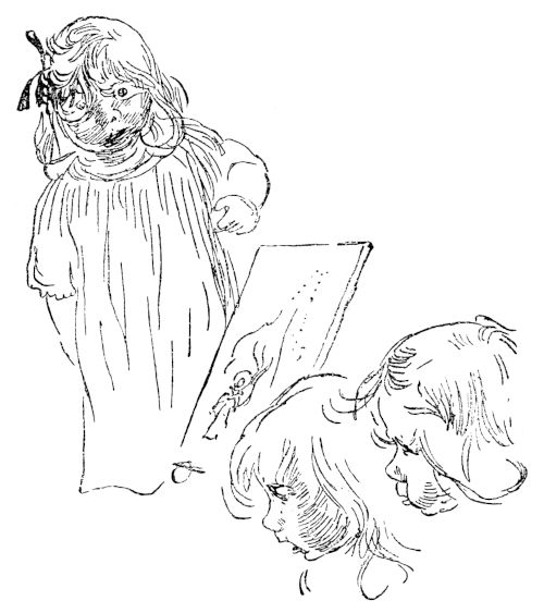 So, jetzt wurde ich der Kleinen habhaft und zufällig gerieten wir vor den Spiegel. Welch’ ein Motiv! Ohne Brita erst los zu lassen, ordnete ich eine Staffelei, langte mir ein Papier und ergriff eine Feder.