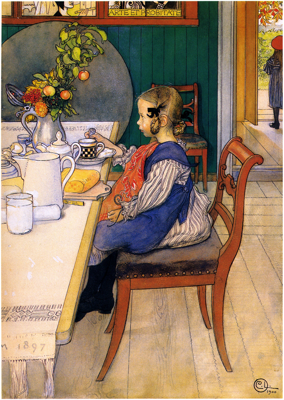 Eine Scherzfrage lautet: „Welche Ähnlichkeit besteht zwischen Kronos und Carl Larsson?“ Und wenn der Dumme, der so gefragt wird, dann zunächst nur den Mund aufsperrt, dann bekommt er zur Antwort: „Daß beide von ihren Kindern leben!“