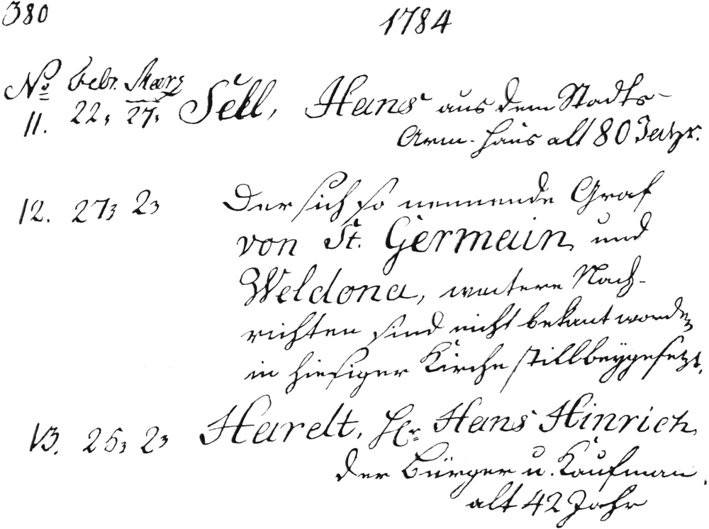 [479] Der Aufenthalt Saint-Germains in Berlin ist durch die drei folgenden Aufzeichnungen beglaubigt. Für die Zeitbestimmung ist die Erwähnung des französischen Gesandten Pons (vgl. S. 341), der von 1772-1782 am Berliner Hofe war, von Bedeutung. Die Zeit bis Sommer 1777 kommt nicht in Frage; denn in der Korrespondenz König Friedrichs mit Alvensleben (vgl. S. 306 ff.) wäre sicher ein früherer Besuch des Abenteurers berührt. Dazu ist sein Aufenthaltsort für die Zeit von 1774 bis Sommer 1777 nachweisbar. Da andrerseits der Graf im Oktober 1778 in Hamburg weilte und von dort im Sommer 1779 nach Schleswig übersiedelte, so bleibt für den Berliner Besuch nur die zwischen Sommer 1777 und Herbst 1778 liegende Frist. Weder das Geheime Staatsarchiv noch das Stadtarchiv in Berlin enthalten Nachrichten über Saint-Germains Aufenthalt daselbst.