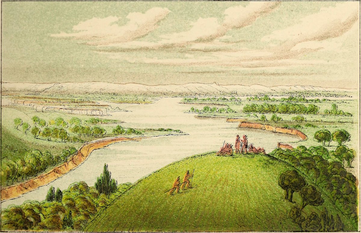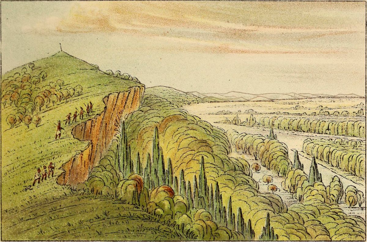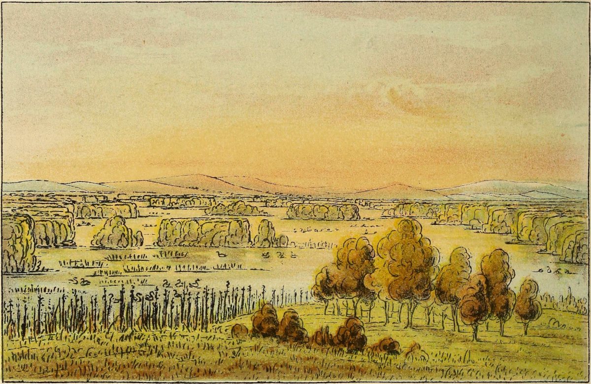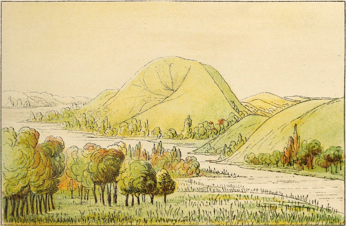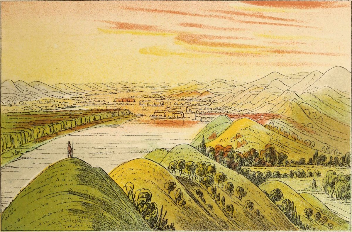 I landed my canoe in front of this grass-covered mound, and all hands being fatigued, we encamped a couple of days at its base. I several times ascended it and sat upon his grave, overgrown with grass and the most delicate wild flowers, where I sat and contemplated the solitude and stillness of this tenanted mound; and beheld from its top, the windings infinite of the Missouri, and its thousand hills and domes of green, vanishing into blue in distance, when nought but the soft-breathing winds were heard, to break the stillness and quietude of the scene. Where not the chirping of bird or sound of cricket, nor soaring eagle’s scream, were internosed ’tween God and man; nor aught to check man’s whole surrender of 5his soul to his Creator. I could not hunt upon this ground, but I roamed from hill-top to hill-top, and culled wild flowers, and looked into the valley below me, both up the river and down, and contemplated the thousand hills and dales that are now carpeted with green, streaked as they will be, with the plough, and yellow with the harvest sheaf; spotted with lowing kine—with houses and fences, and groups of hamlets and villas—and these lovely hill-tops ringing with the giddy din and maze, or secret earnest whispers of lovesick swains—of pristine simplicity and virtue—wholesome and well-earned contentment and abundance—and again, of wealth and refinements—of idleness and luxury—of vice and its deformities—of fire and sword, and the vengeance of offended Heaven, wreaked in retributive destruction!—and peace, and quiet, and loveliness, and silence, dwelling again, over and through these scenes, and blending them into futurity!