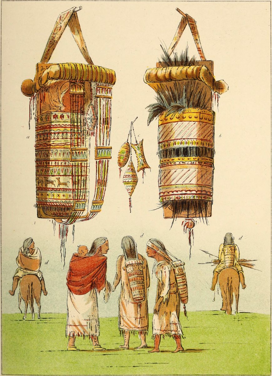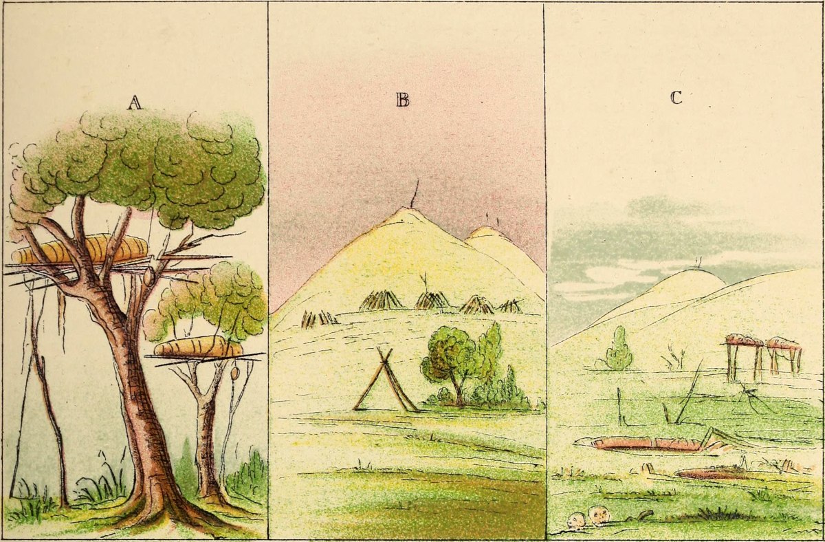 Almost every mile I have advanced on the banks of this river, I have met evidences and marks of Indians in some form or other; and they have generally been those of the Sioux, who occupy and own the greater part of this immense region of country. In the latter part of my voyage, however, and of which I have been speaking in the former part of this Letter, I met the ancient sites of the O-ma-ha and Ot-to towns, which are easily detected when they are met. In plate 121 (letter a), is seen the usual mode of the Omahas, of depositing their dead in the crotches and on the branches of trees, enveloped in skins, and never without a wooden dish hanging by the head of the corpse; probably for the purpose of enabling it to dip up water to quench its thirst on the long and tedious journey, which they generally expect to enter on after death. These corpses are so frequent along the banks of the river, that in some places a dozen or more of them may be seen at one view.
