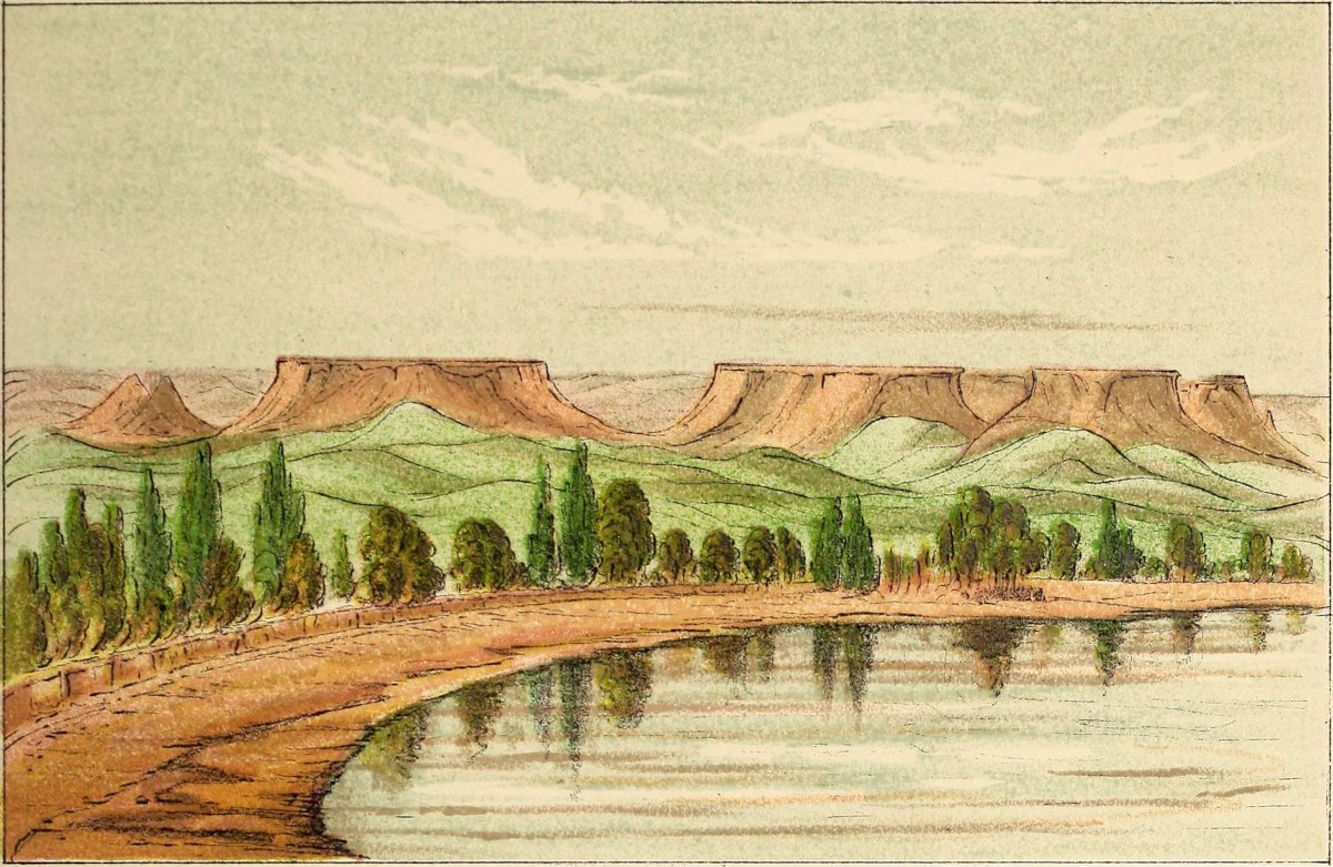 An hundred miles above this, I passed a curious feature, called the “Square Hills” (plate 123). I landed my canoe, and went ashore, and12 to their tops, to examine them. Though they appeared to be near the river, I found it half a day’s journey to travel to and from them; they being several miles from the river. On ascending them I found them to be two or three hundred feet high, and rising on their sides at an angle of 45 degrees; and on their tops, in some places, for half a mile in length, perfectly level, with a green turf, and corresponding exactly with the tabular hills spoken of above the Mandans, in plate 39, Vol. I. I therein said, that I should visit these hills on my way down the river; and I am fully convinced, from close examination, that they are a part of the same original superstratum, which I therein described, though seven or eight hundred miles separated from them. They agree exactly in character, and also in the materials of which they are composed; and I believe, that some unaccountable gorge of waters has swept away the intervening earth, leaving these solitary and isolated, though incontrovertible evidences, that the summit level of all this great valley has at one time been where the level surface of these hills now is, two or three hundred feet above what is now generally denominated the summit level.