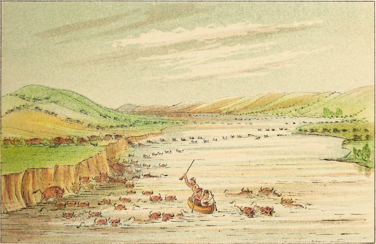 In one instance, near the mouth of White River, we met the most immense herd crossing the Missouri River—and from an imprudence got our boat into imminent danger amongst them, from which we were highly delighted to make our escape. It was in the midst of the “running season,” and we had heard the “roaring” (as it is called) of the herd, when we were several miles from them. When we came in sight, we were actually terrified at the immense numbers that were streaming down the green hills on one side of the river, and galloping up and over the bluffs on the other. The river was filled, and in parts blackened, with their heads and horns, as they were swimming about, following up their objects, and making desperate battle whilst they were swimming.