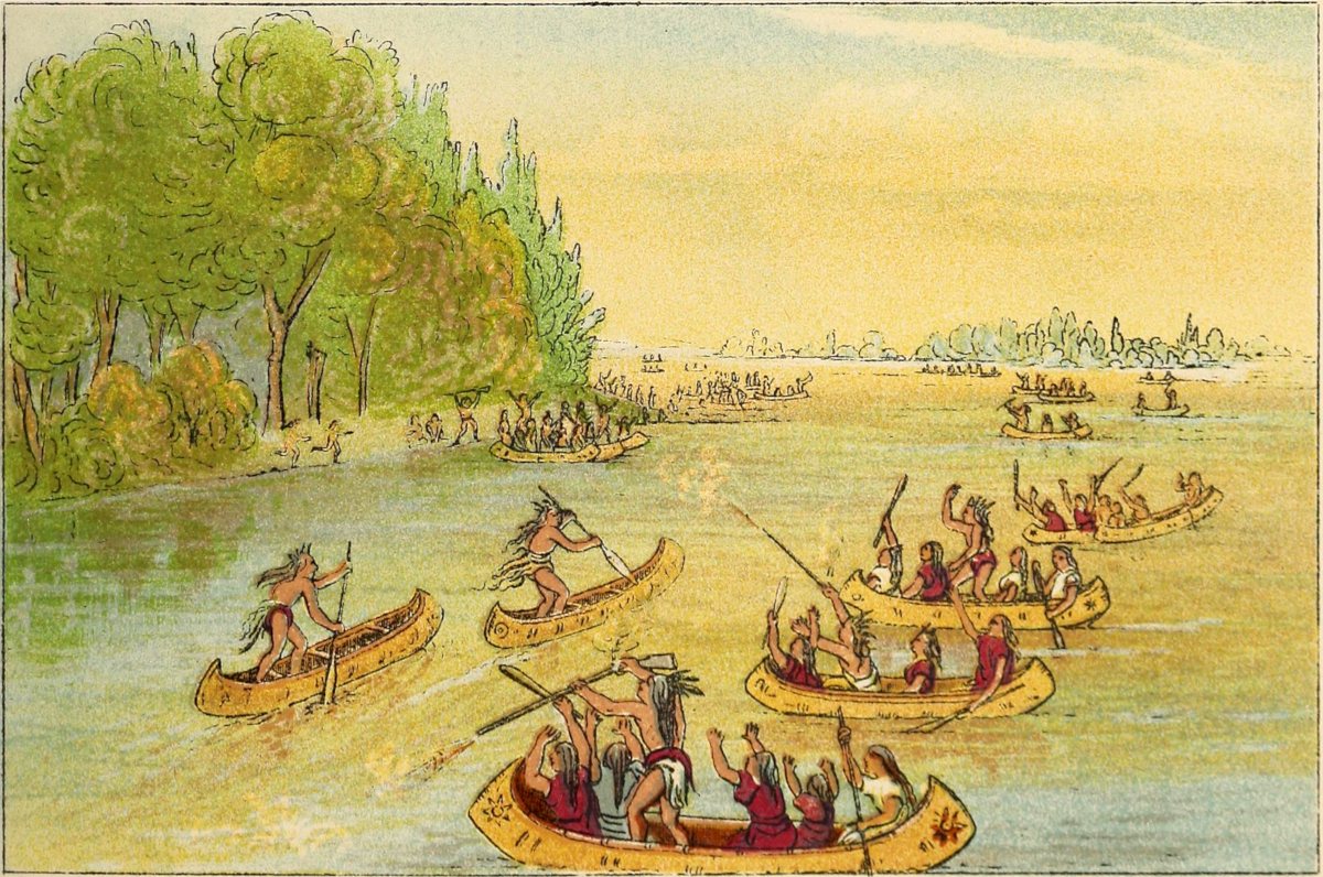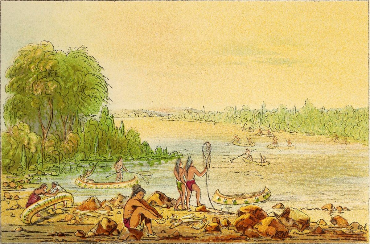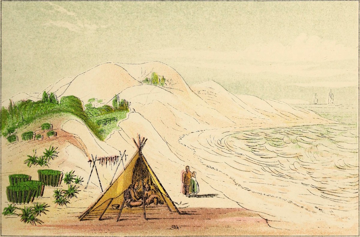My voyage from the mouth of the Teton River to this place has been the most rugged, yet the most delightful, of my whole Tour. Our canoe was generally landed at night on the point of some projecting barren sand-bar, where we straightened our limbs on our buffalo robes, secure from the annoyance of musquitoes, and out of the walks of Indians and grizzly bears. In addition to the opportunity which this descending Tour has afforded me, of visiting all the tribes of Indians on the river, and leisurely filling my portfolio with the beautiful scenery which its shores present—the sportsman’s fever was roused and satisfied; the swan, ducks, geese, and pelicans—the deer, antelope, elk, and buffaloes, were “stretched” by our rifles; and some times—“pull boys! pull!! a war party! for your lives pull! or we are gone!”