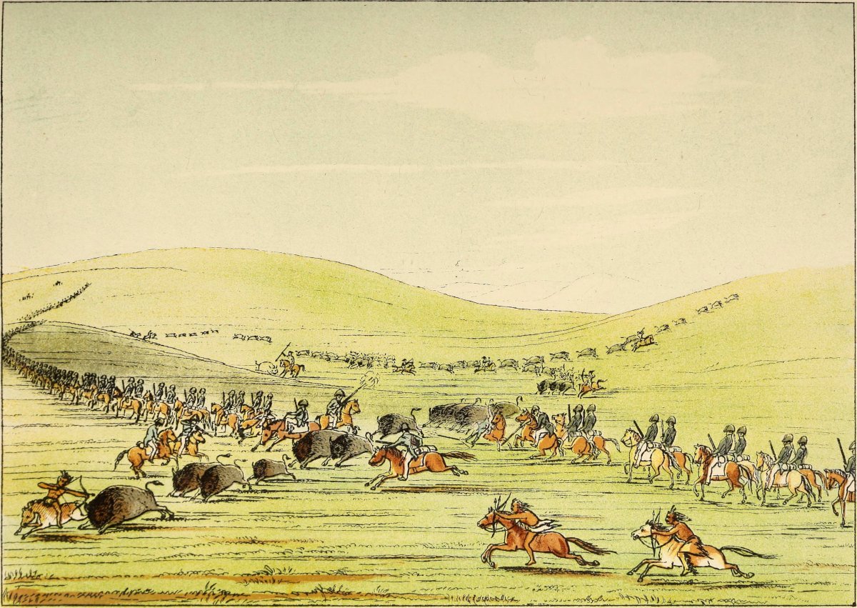 We met immense numbers of buffaloes in the early part of our voyage and used to land our canoe almost every hour in the day; and oftentimes all together approach the unsuspecting herds, through some deep and hidden ravine within a few rods of them, and at the word, “pull trigger,” each of us bring down our victim (plate 125).