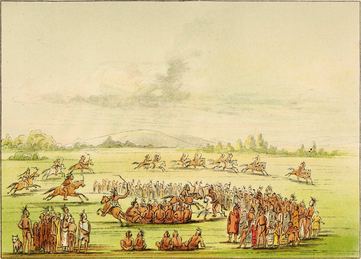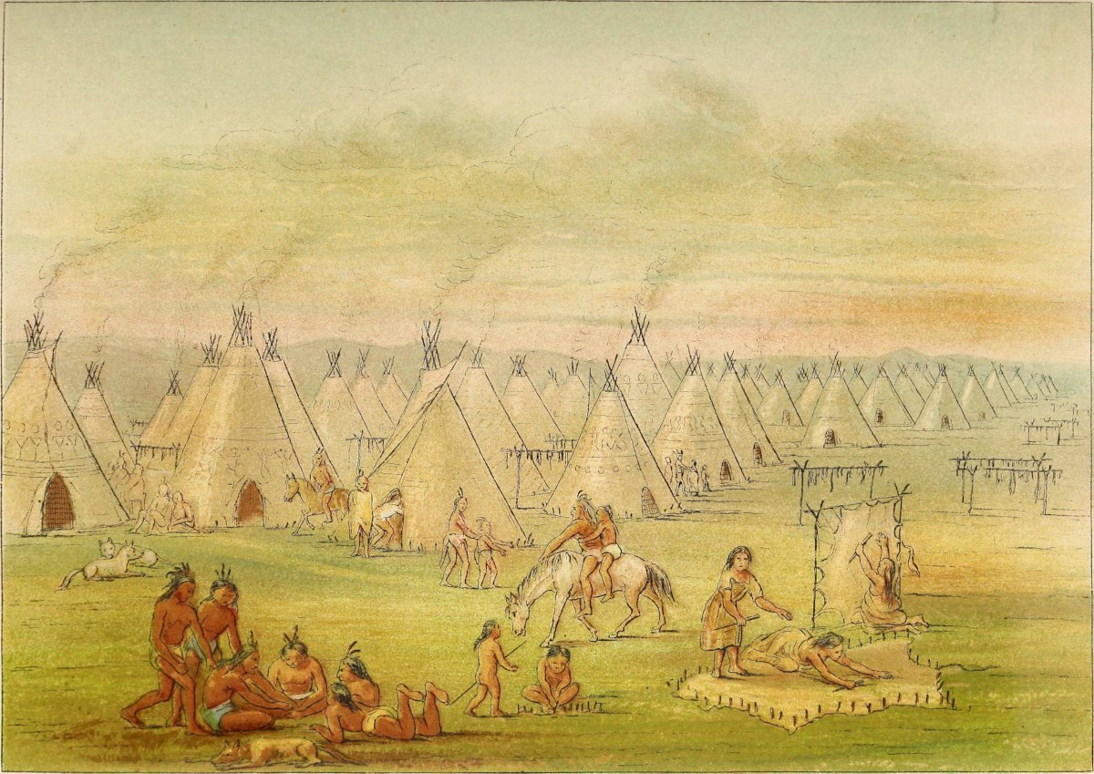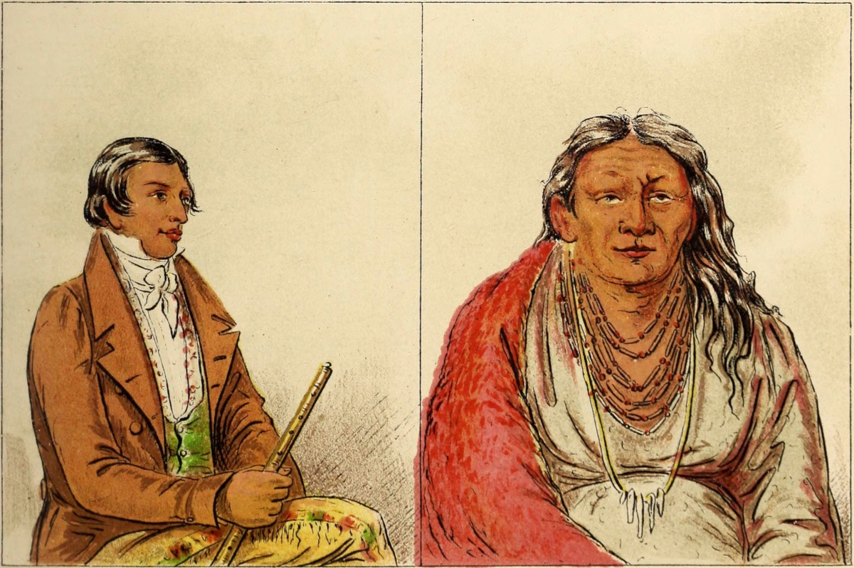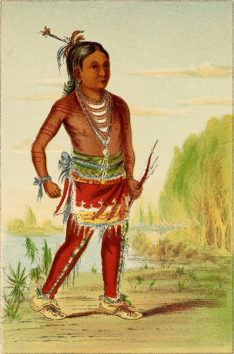 Since writing the last epistle, some considerable time has elapsed, which has, nevertheless, been filled up and used to advantage, as I have been moving about and using my brush amongst different tribes in this vicinity. The Indians that may be said to belong to this vicinity, and who constantly visit this post, are the Ioways—Konzas—Pawnees—Omahas—Ottoes, and Missouries (primitive), and Delawares—Kickapoos—Potawatomies—Weahs—Peorias—Shawanos, Kaskaskias (semi-civilized remnants of tribes that have been removed to this neighbourhood by the Government, within the few years past). These latter-named tribes are, to a considerable degree, agriculturalists; getting their living principally by ploughing, and raising corn, and cattle and horses. They have been left on the frontier, surrounded by civilized neighbours, where they have at length been induced to sell out their lands, or exchange them for a much larger tract of wild lands in these regions, which the Government has purchased from the wilder tribes.