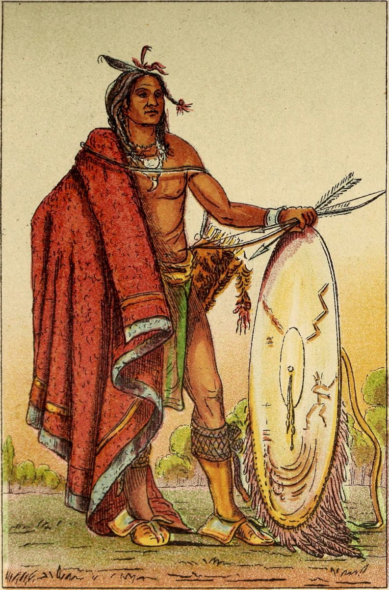 The son of White Cloud, who is now chief, and whose portrait I have just named, was tastefully dressed with a buffalo robe, wrapped around him, with a necklace of grizzly bear’s claws on his neck; with shield, bow, and quiver on, and a profusion of wampum strings on his neck.