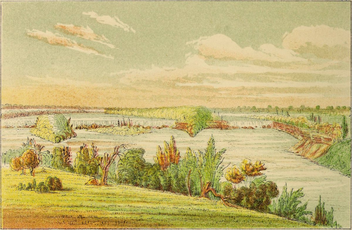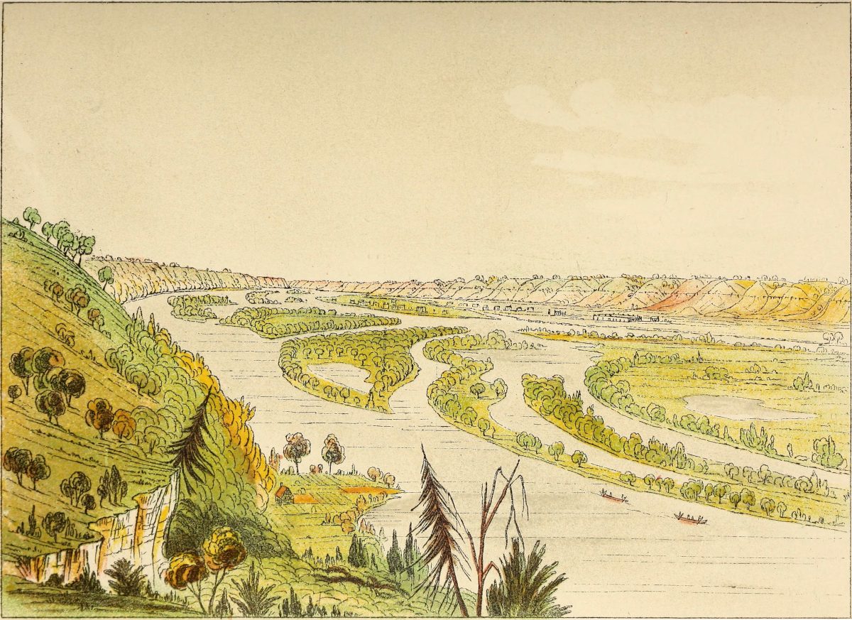 The mouth of the Platte (plate 124), is a beautiful scene, and no doubt will be the site of a large and flourishing town, soon after Indian titles shall have been extinguished to the lands in these regions, which will be done within a very few years. The Platte is a long and powerful stream, pouring in from the Rocky Mountains and joining with the Missouri at this place.