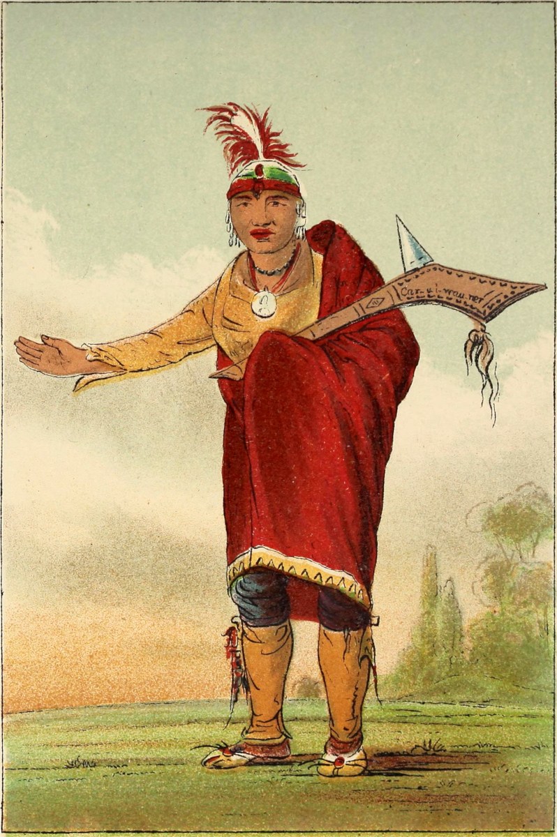 Pah-ta-coo-che (the shooting cedar, plate 131), and Was-com-mun (the busy man, plate 132), are also distinguished warriors of the tribe; tastefully dressed and equipped, the one with his war-club on his arm, the other with bow and arrows in his hand; both wore around their waists beautiful buffalo robes, and both had turbans made of vari-coloured cotton shawls, purchased of the Fur Traders. Around their necks were necklaces of the bears’ claws, and a profusion of beads and wampum. Their ears were profusely strung with beads; and their naked shoulders curiously streaked and daubed with red paint.