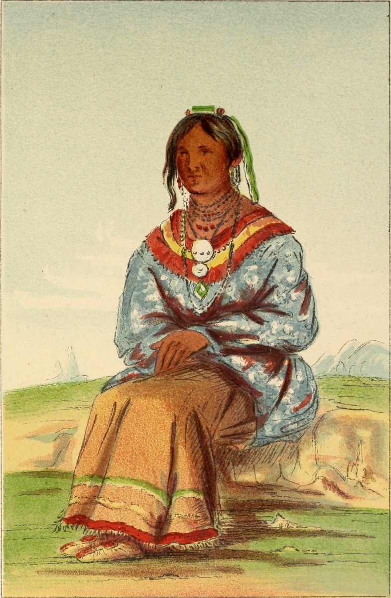 Before I give further account of this downward voyage, however, I must recur back for a few moments, to the Teton River, from whence I started, and2 from whence my last epistles were written, to record a few more incidents which I then overlooked in my note-book. Whilst painting my portraits amongst the Sioux, as I have described, I got the portrait of a noble Shienne chief, by the name of Nee-hee-o-ee-woo-tis, the wolf on the hill (plate 115). The chief of a party of that tribe, on a friendly visit to the Sioux, and the portrait also of a woman, Tis-see-woo-na-tis (she who bathes her knees, plate 116). The Shiennes are a small tribe of about 3000 in numbers, living neighbours to the Sioux, on the west of them, and between the Black Hills and the Rocky Mountains. There is no finer race of men than these in North America, and none superior in stature, excepting the Osages; scarcely a man in the tribe, full grown, who is less than six feet in height. The Shiennes are undoubtedly the richest in horses of any tribe on the Continent, living in a country as they do, where the greatest herds of wild horses are grazing on the prairies, which they catch in great numbers and vend to the Sioux, Mandans and other tribes, as well as to the Fur Traders.