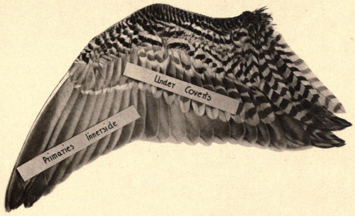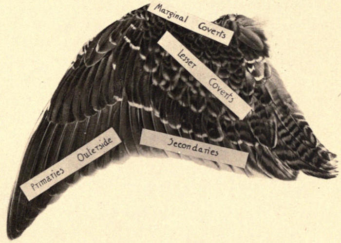The illustrations, facing this page, of both sides of a Snipe’s wing will show the reader the precise places from which the various wing feathers, described in the text, are taken, and while the descriptions of the feathers may not satisfy the naturalist, they are sufficient for the purposes of the writers.