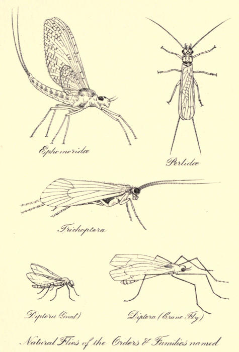Under the name of each fly, in giving its dressing, the name of the order or family to which the natural insect as represented by the artificial belongs will be found, and opposite page 12 reproductions of typical examples of each of the orders or families of natural insects mentioned will be found, with the exception of the Ant and Green Insect. The latter are so well known as to need no illustration. The beginner will therefore have an idea of the fly he is copying and perhaps be able to identify it at the stream side. It must not be forgotten however that certain patterns represent more than one species of fly.