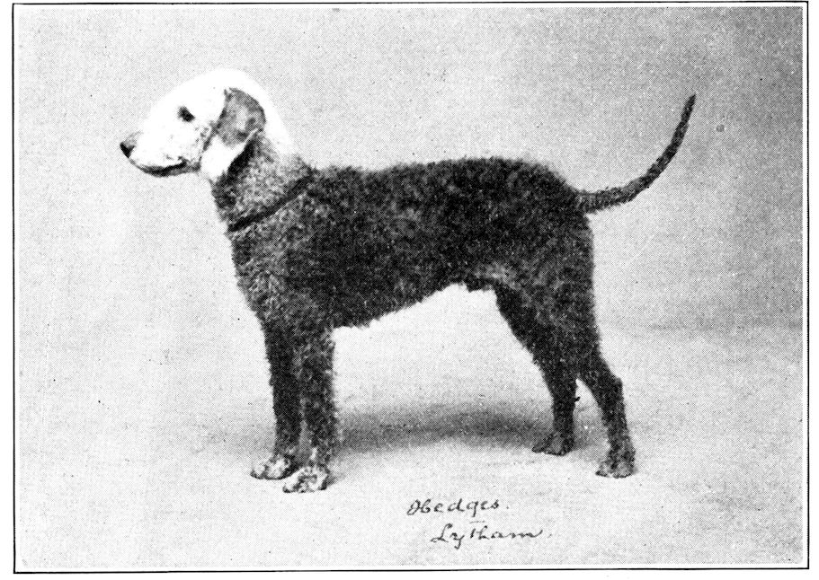 In general appearance the Bedlington is a lightly built, lathy dog, but not shelly. The skull is narrow, deep and rounded, high at the occiput, covered with a nice silky tuft or top-knot. His muzzle must be long and tapering. The eyes are small, placed obliquely, and close together, and in shade should follow the color of the dog. The ears are moderately large, placed low, thinly covered and tipped with fine silky hair, and filbert shaped. The neck is long and chest deep, though not wide. The back should be slightly arched, and the body well ribbed up. The tail is thick at the root and scimitar shaped. The coat is a mixture of hard and soft hair, of the stand-off variety, and crisp to the touch.