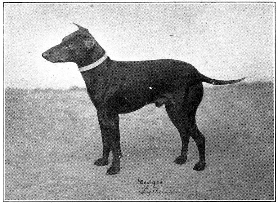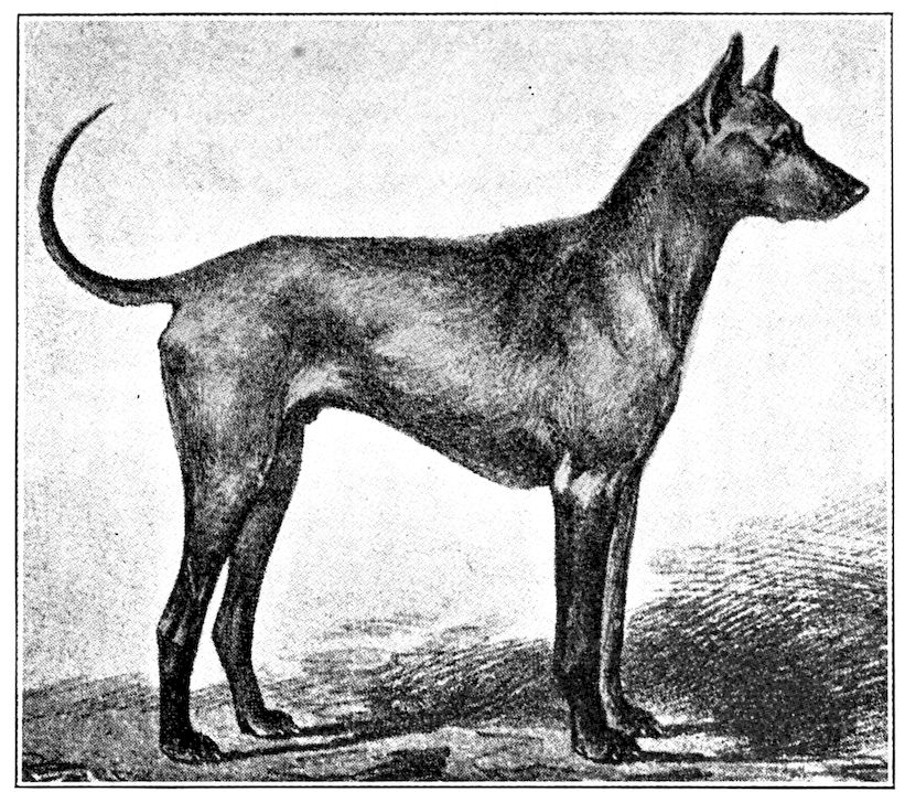 This is a good boned dog with the appearance of speed and activity rather than of strength, and he should be free of any approach to the whippet type. Head should be long, flat and narrow at skull, level and wedge-shaped, and well filled up before the eyes, which should be small, brilliant and dark. The ears if cropped should be carried erect. Chest narrow and deep, body moderately short with well sprung ribs. The tail is rather short and should not be carried higher than the back, and the coat is close, smooth, short and glossy.
