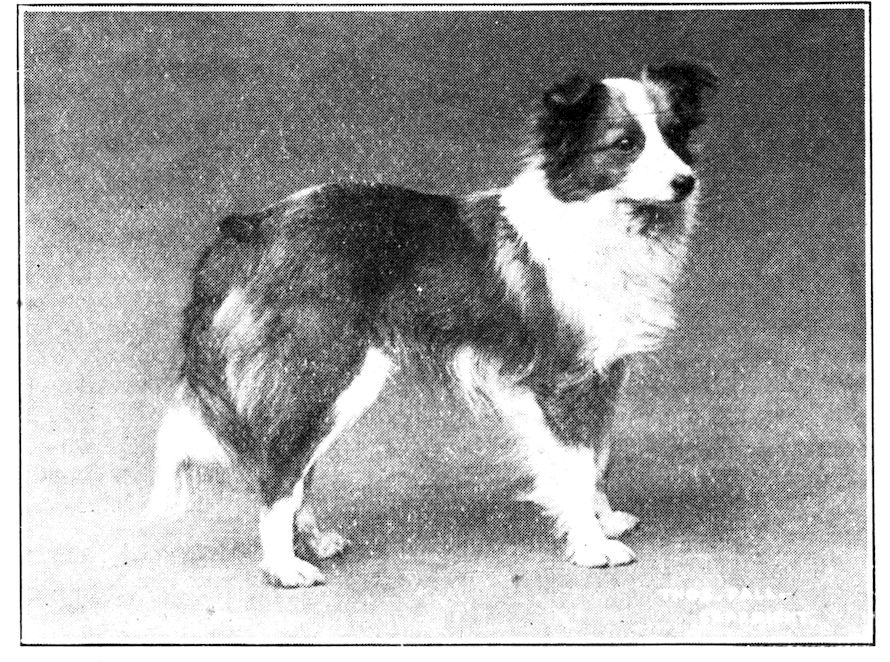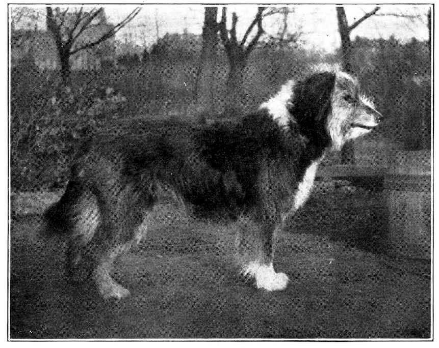The collie is a lithe, active dog, and is remarkable chiefly for his intelligent, cunning, yet kindly outlook, his magnificent coat and the devotion he displays to his master. The elegance of his outline is quite distinct from any other breed and shows great strength and activity. The head should be moderately long, proportionate to the size of the dog, with a flat skull moderately wide between the ears, and a very slight elevation at the eyebrows, and very little “stop.” The muzzle should be well filled up before the eyes. The ears are small and when at attention should be carried semi-erect, with the tips turning slightly outwards. The eyes are a most important feature in this breed. They should be almond-shaped, not too large or too small, set obliquely in the head, and of a dark hazel color. The blue merles should have a merled or “China” eye, though this is not an essential. On the size, color and placing of the eyes, together with the size and placement of the ears depends the expression and characteristic outlook which is so appreciated by connoisseurs. The neck should be long, body fairly short, with well sprung ribs, chest deep and forelegs straight. Any tendency to cow-hocks in the hind legs should be penalized. The tail should be fairly long, carried low when in repose, and straight or gaily when excited. The coat, except on the mask, tips of ears and legs where it is smooth, should be very abundant, especially around the neck and chest, where it should form a distinct cape and frill. A dense undercoat is also very essential.