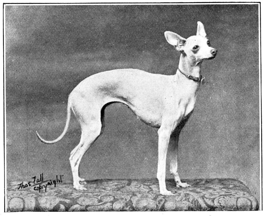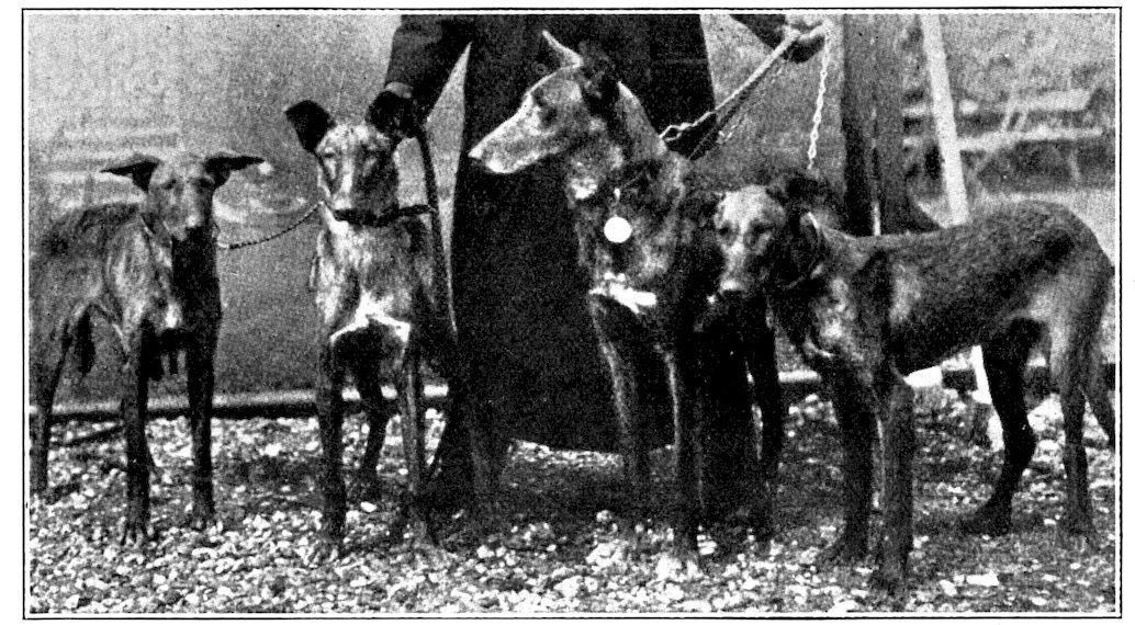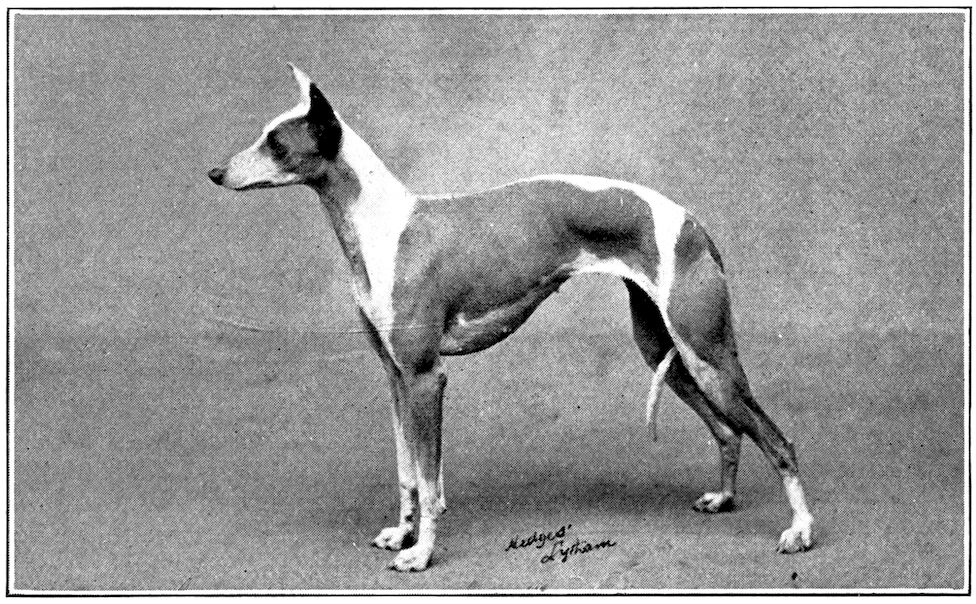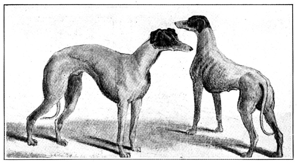 This dog is a greyhound in miniature. The weights of the racing whippet vary from 10 to 23 lbs., the best running weight being about 16 lbs., which is also considered the best size for an ideal show specimen.