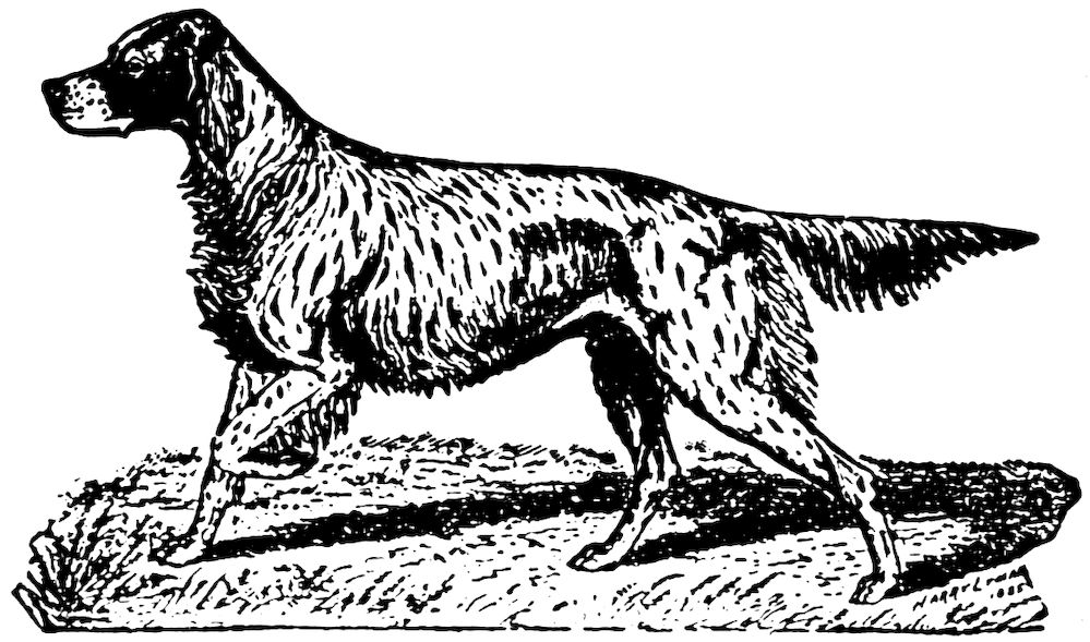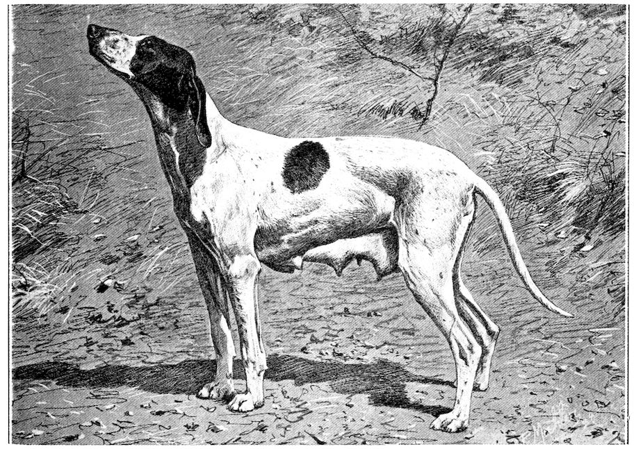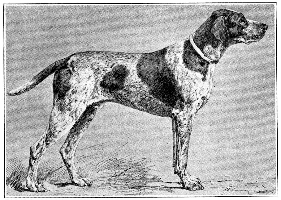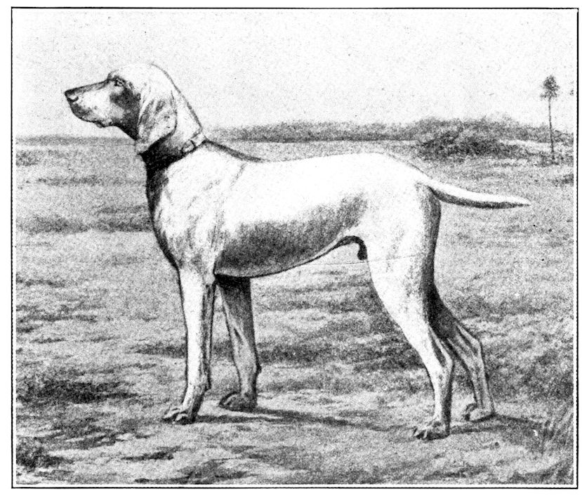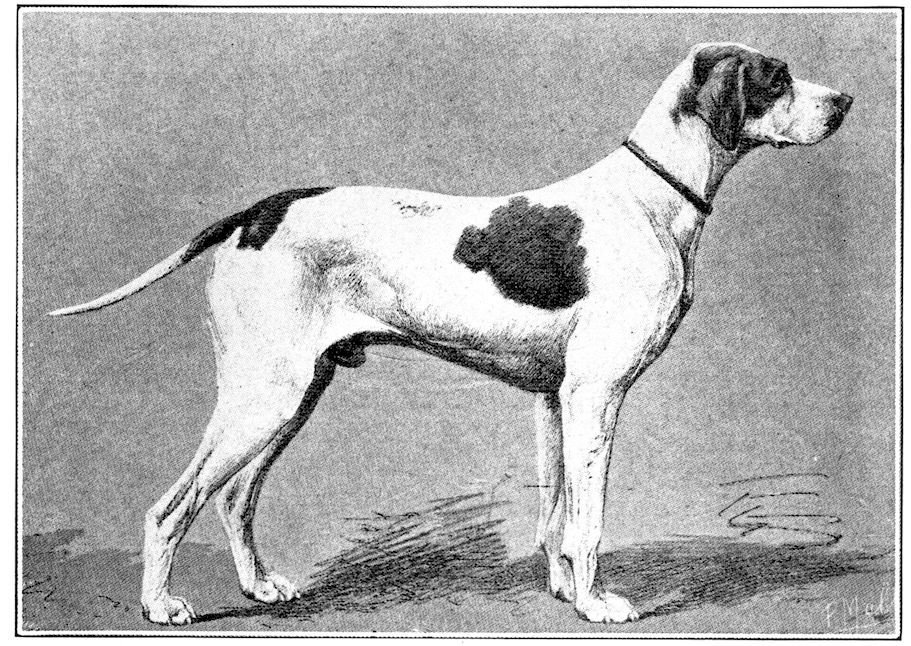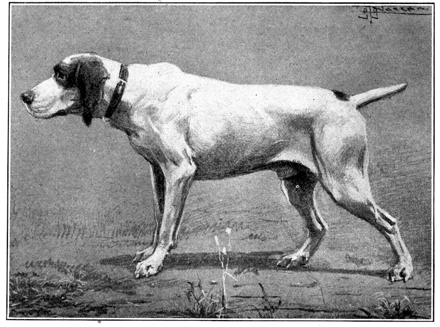 The Pointer is an elegantly shaped dog, symmetrical and well built all over, of great strength and endurance, yet full of refinement and very speedy. The leading essentials of a good Pointer are pace, endurance, intelligence, and powers of smell. The head should be fairly long and broad at the skull, muzzle long and well filled up. Eyes soft and dark brown in color. Ears soft and hanging gracefully. Neck well arched and long, free from dewlap or throatiness. Ribs well arched. Loins and hind quarters very muscular. The stern must be strong at the root and free from the slightest approach to curl at the tip.