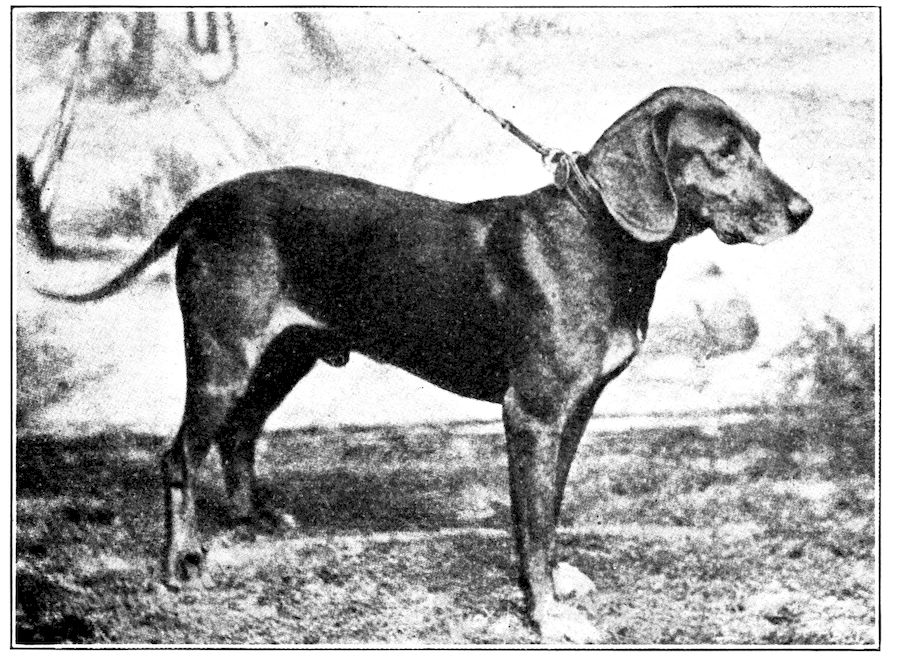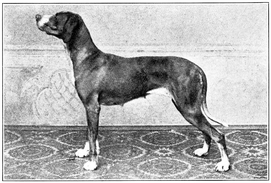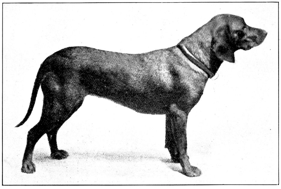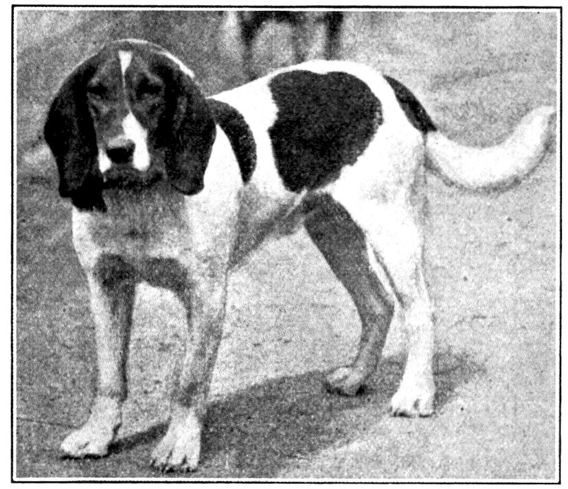 This is a well built and symmetrical dog with a large head, domed in skull, “stop” not too pronounced, occipital bone fairly well developed and with good length of muzzle. The eyes are rather small and brown in color. Nose sharp with open nostrils. The ears are set on low and lay close to the head. The back is strong and muscular, and chest deep. Legs straight, long and muscular. Stern is of medium length, carried higher than the back and the coat short and dense.