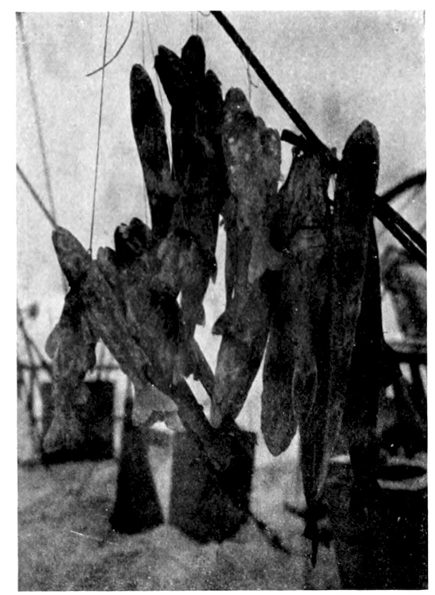 376Imagine, then, the arrival of a box—which most probably in a civilised community, would be looked upon as a cartload of rubbish. Placed within the vision of the unspoiled Eskimo, it becomes transformed into Dantes’s grotto filled with “such stuff as dreams are made of.” With fox-like inquisitiveness, the object is approached. Each article is touched, felt and examined; and later, as the “village gossips” get together, we listen to the cheery verboseness of “Sairy Gamp” and Megipsu, discussing the riches of the Koblunah (white man).