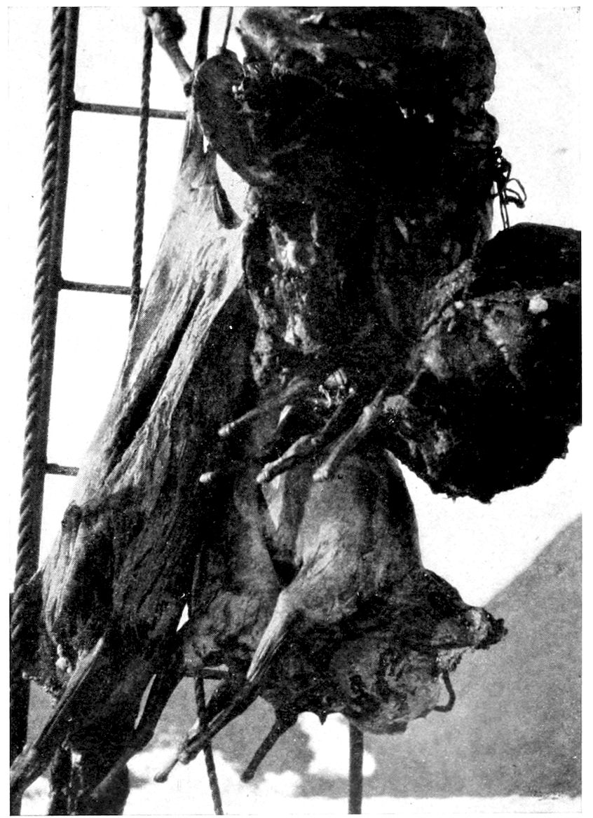 There exists among these people a form of hysteria known as piblocto (the same name as given to the well-known madness among their dogs), with which women, more frequently than men, are afflicted. During these spells, the maniac removes all clothing and prances about like a broncho. In 1898 while the Windward was in winter quarters off Cape D’Urville, a married woman was taken with one of these fits in the middle of night. In a state of perfect nudity she walked the deck of the ship; then, seeking still greater freedom, jumped the rail, on to the frozen snow and ice. It was some time before we missed her, and when she was finally discovered, it was at a distance of half a mile, where she was still pawing, and shouting to the best of her abilities. She was captured and brought back to the ship; and then there commenced a wonderful performance of mimicry in which every conceivable cry of local bird and mammal was reproduced in the throat of Inaloo. This same woman at other times attempts to walk the ceiling of her igloo; needless to say she has never succeeded.
