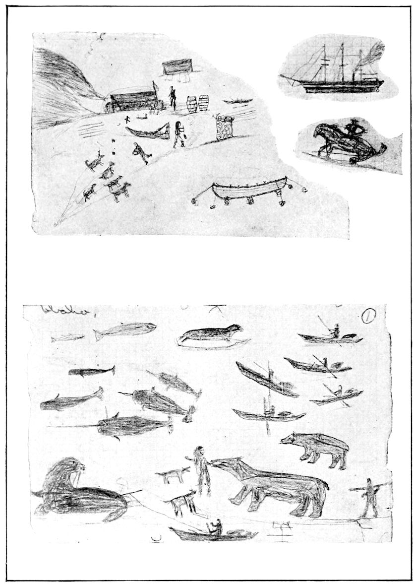 379In their own country, Eskimos care little or nothing about acquiring the use of our language. The fact is, their savage environment and continuous struggle for existence is hardly conducive to learning of any kind, beyond the absolute necessaries. Some of the tribe were taught the use of numerals, the alphabet, and a few easy words; and, parrot-like, these pupils had an embarrassing aptitude for picking up the loose words of the sailors. But as to a common means of communication, their good sense argued that it was much the simpler for us to learn their language.