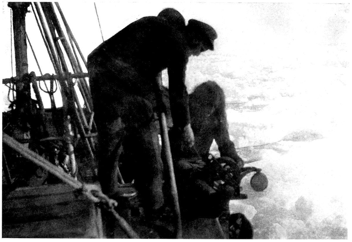 To return to the hull model. In the Fram everything was sacrificed to secure certainty of lifting under pressure. In the Gauss, which is a modified Fram, while the broad beam of the Fram (thirty-six feet) was retained, greater length was given the ship to render her a better sea boat for the long voyage from Germany to the Antarctic Circle. Her ratio is 1 to 4.25 as compared with the Fram’s 1 to 3.25. The Gauss’s draft, however, is excessive (nineteen feet).