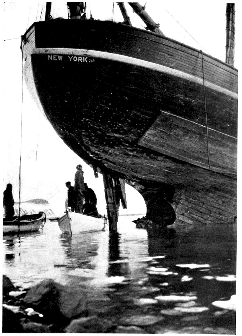 The keel of the Roosevelt was laid October 15, 1904, 370in the McKay & Dix shipyard at Bucksport, Maine, and the ship was launched the 23d of March, 1905, Mrs. Peary shattering a block of ice containing a bottle of champagne against the steel-clad stem as the hull glided down the ways and christening the ship Roosevelt.