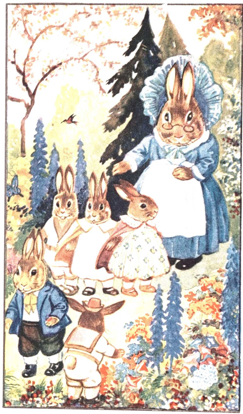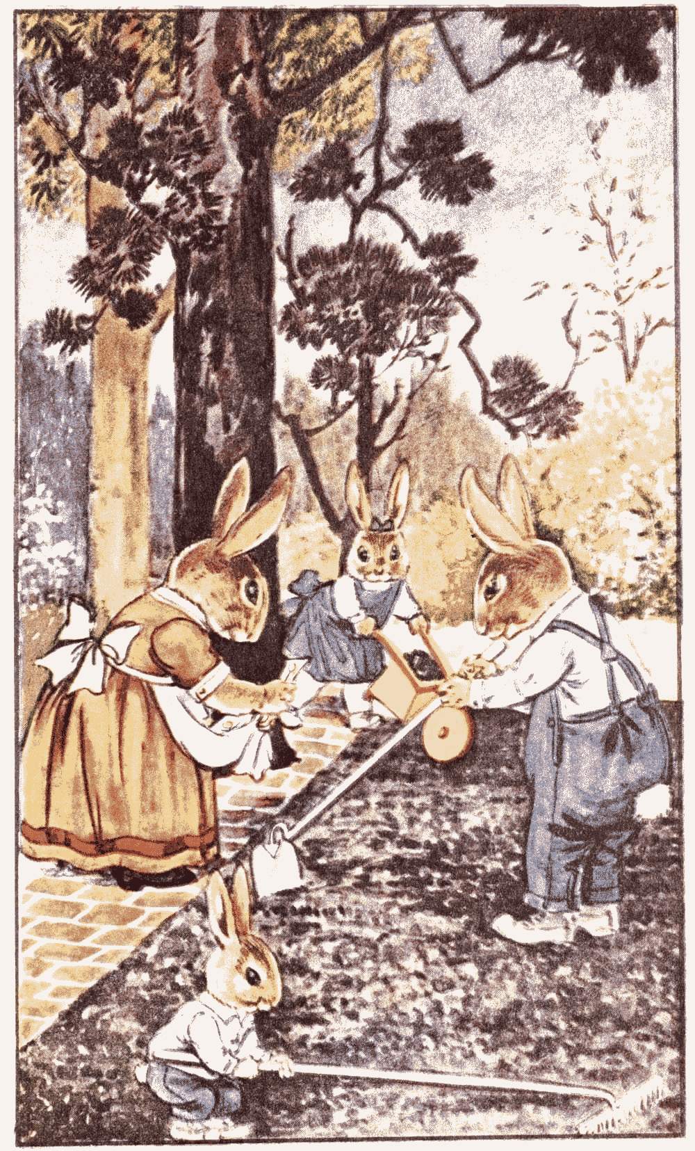 So those cute little Bunnies ran out with rake, and hoe, and wheelbarrow, and they all worked in Mother Bun’s garden, helping her prepare the soil for her garden. She was very happy and shook the packages of seeds in her gingham apron, saying,