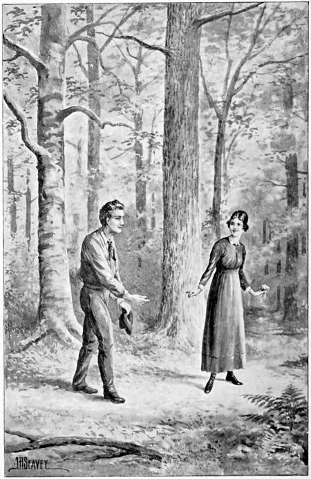 You chaps who have been through something of the same circumstances will appreciate how hard it was for Robert to stay away from the newly-discovered cabin even for a week. Every evening when[123] his day’s work was done, even though he was tired enough to drop, he felt an almost unbearable impulse to walk the few miles which separated his cabin from the other home. He felt, however, that the good impression he had made the previous Sunday should be preserved, and he tried to work all the harder so that the temptation would not be so strong. It was not surprising that he woke early the following Sunday, and it was not surprising also that after his few regular duties were done he was particular to spend some little time looking after his personal appearance. Clothes were not a matter of much import those days and his appearance was something which had not heretofore bothered Robert very much. Now, however, with his new experience was coming a new feeling that he must be worthy of his new-found love in every way, and also he was anxious to appear as well as possible in her eyes. The weather was threatening that morning, but the young man could not have been held away from the other home by iron bars. As soon as he dared he started off through the forest, and again the birds sang sweetly to him and the flowers looked specially beautiful, as they had done on the previous Sunday. Arriving at the cabin he found the door open and knocked with some little diffidence, stepping to one side and waiting for an answer. In a moment he was welcomed with a pleasant smile by the one he[124] wanted most to see. She, too, had been spending some little time over her dress. Her rosy-golden hair was neatly coiled around her shapely head. Robert had learned her name on his previous visit, when her mother had addressed her simply as “Mary,” and in consequence he greeted her naturally and simply with a “Good-morning, Mary,” and in reply she called him just as naturally by his name.