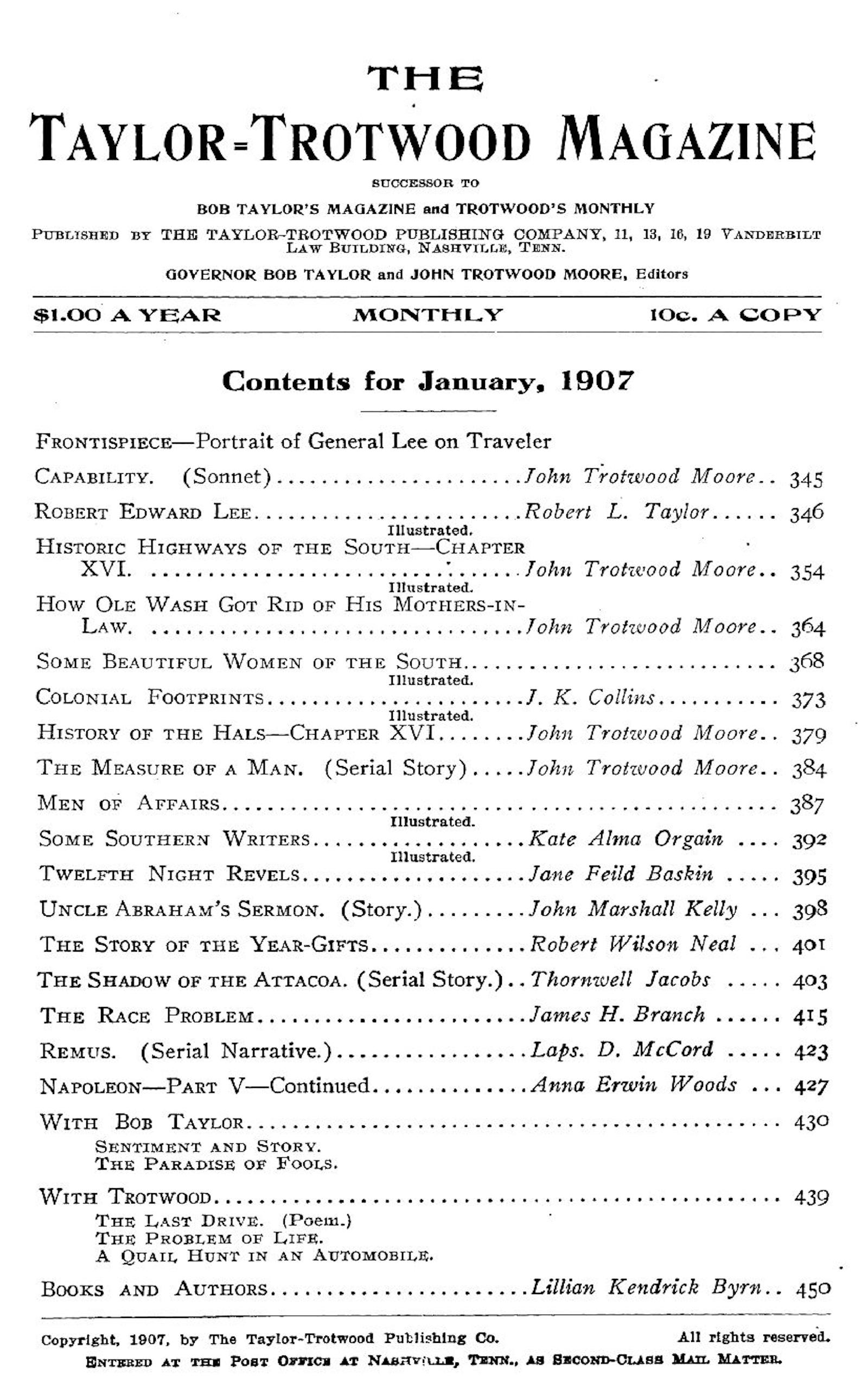 Trotwood personally wishes to assure his friends that the Taylor-Trotwood magazine will continue to follow the same literary lines and to follow the same plans and literary methods Trotwood’s Monthly has pursued from the beginning. In short, it will be the same old Trotwood with better facilities, larger scope, a greater field, more capital and a wider influence, assisted from the United States Senate by the wit, pathos and humor of the inimitable Bob Taylor, the friend and champion of the plain, honest, common people of his country. We congratulate ourselves and feel warranted in congratulating the many thousand readers of Trotwood.
