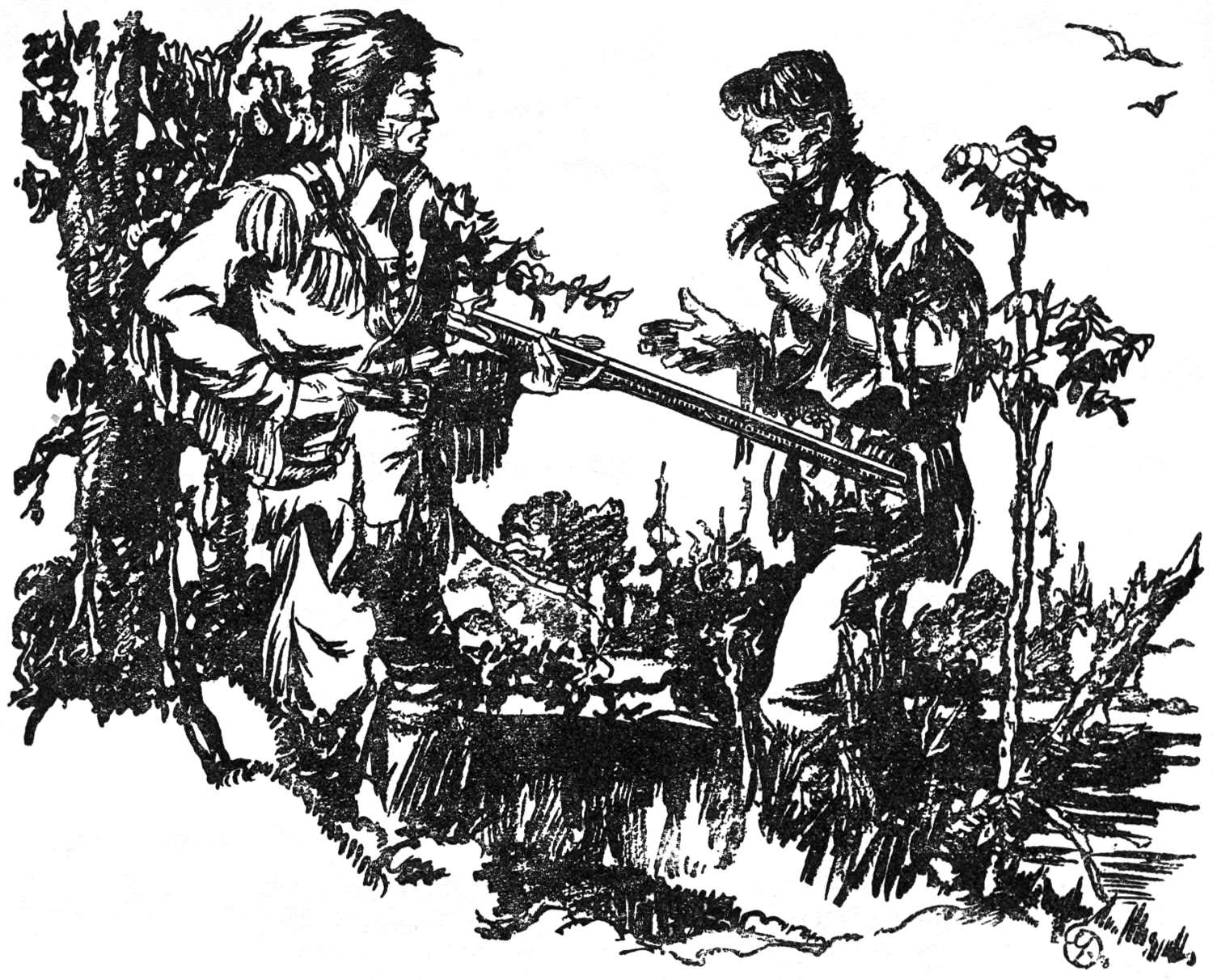A man stepped into the path between the two men, his arms raised, one holding a long Kentucky rifle. He said: “Here I be. Had to fetch the old gun along. Think I was red?”