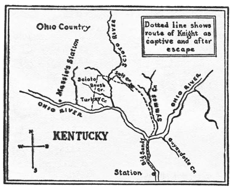 With the first light he was continuing his flight and fought pains and aches for several miles before his legs limbered up. Two hours after sunrise he killed a squirrel with a rock and ate the scanty meat raw. Fortunately his mind focused on the fear behind him and he did not take time to realize he might run into another band of Indians at any moment. He entered the rugged hills around Sunfish creek. He was determined to use every hour of light for travel, and fear served as food and drink in keeping him going. Traveling south, he crossed Scioto Brush and Turkey Creek; and everything seemed unreal. Another night and day, and he halted and stared stupidly when he beheld a broad river, which, he knew, must be the Ohio. He was ten miles below the mouth of the Scioto. He had no idea of how and when he had rested, of the meager food of nuts and raw squirrel meat. But he did know he was gazing on the Ohio and the Kentucky shore beyond. His problem now was to cross the river although it was very possible that would mean from pan to fire. He remembered poor Bryant’s advice to make for Massie’s Station, but he had no idea whether he was above or below it. Nor did he know how much time had elapsed since he struck Little Beaver and escaped from the Salt Creek camp.