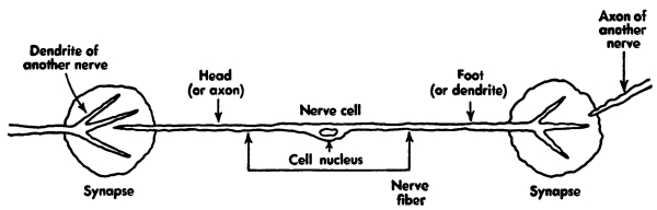 The structure between the end of one nerve and the beginning of the next is called a synapse (see Fig. 1). No one really knows very much about synapses, for they are extremely small and it is not easy to tell where a synapse stops and other stuff begins. Impulses travel through synapses in from ½ to 3 thousandths of a second. An impulse travels through a synapse only in one direction, from the head (or axon) of one nerve fiber to the foot (or dendrite) of another. It seems clear that the activity in a synapse is chemical. When the head of a nerve fiber brings in an impulse to a synapse, apparently a chemical called acetylcholine is released and may affect the foot of another fiber, thus transmitting the impulse; but the process and the conditions for it are still not well understood.
