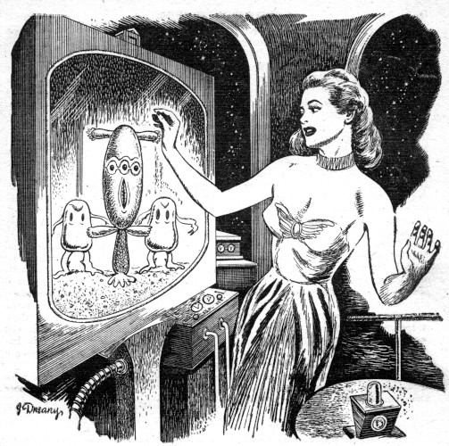 "Harlow, Midge," said Samson slowly after a time, "there's one other thing about life in this universe that's been puzzling us for the last six centuries. We know now that it has nothing to do with the intelligence level, but we still don't know why everybody else but us reproduces by simple division, budding, spores or conjugation—and in consequence, lives a damn sight longer than we do, almost long enough to make up for their low native intelligence. But just suppose that Earth really is a freak planet—suppose that even the Kassids have never run into a bisexual organism before. I didn't mention it to them, and I'm willing to bet Jackson didn't either. You know how tough it is to explain to a xeno—it generally takes ten days to convince them you're not kidding. And, Harlow—suppose that I go down there again, and take Midge along...."