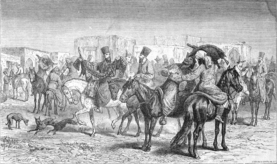 A Dervaze No-n keresztül tartám bevonulásomat, s bizonyára nem egyhamar fogom feledni, mennyi fáradságomba került a szamarak, tevék és öszvérek tömegén át, melyek szalmával, árpával, persa s európai árukötegekkel megrakva, a kapu bejáratánál borzasztó rendetlenségben tolongtak, magamnak utat törnöm. Lábaimat a nyeregben magam alá kapva, s a többiekhez hasonlóan „khaberdar! khaberdar“-t (vigyázz!) kiáltva, sikerült végre a városba behatolnom. Nem kevesebb bajjal törtem keresztül a bazáron, s valóban örültem, midőn végre minden zúzás, ütés vagy szúrás nélkül a török követség palotájához értem.