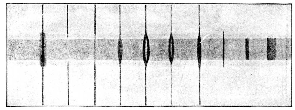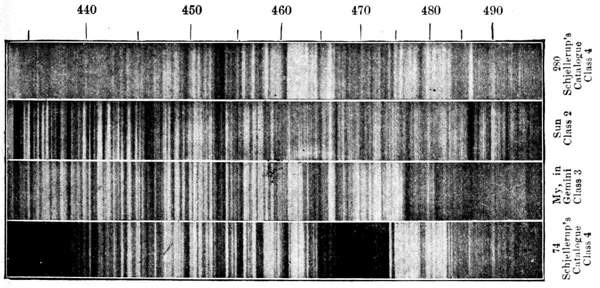 [13] When, standing on a station platform, we watch an express train rushing through the station, the pitch of the engine whistle seems to become higher as long as the train is approaching us, and deeper again when the train is moving away from us. The pitch of a note depends upon the number of oscillations which our ear receives per second. Now, when the train is fast approaching us, more vibrations are sent into our ear than when the train is at a stand-still, and the pitch, therefore, appears to become higher. The same reasoning holds for light waves, of which Doppler, of Prague (Bohemia), was in fact thinking when first announcing his principle in 1842. The wave-length of a particular color of the spectrum is fixed with the aid of some Fraunhofer line characteristic of a certain metal. If we compare the spectrum of a star and the spectrum of a glowing metal, photographed on the same plate, the stellar lines will appear shifted towards the violet end (violet light is produced by nearly twice as many vibrations of the ether per second as red light) when the star is moving towards us in the line of sight. This principle has successfully been applied by Huggins, H. C. Vogel, and others, for determining the motion of a star in our line of sight. When a star is revolving about its own axis, the equatorial belt will seem to come nearer to us (or to recede from us), while the polar regions will seem to be at a stand-still; the lines will then appear oblique (not vertical). In this way Keeler proved that the rings of Saturn consists of swarms of meteorites moving at different velocities in the different rings.—H. B.
