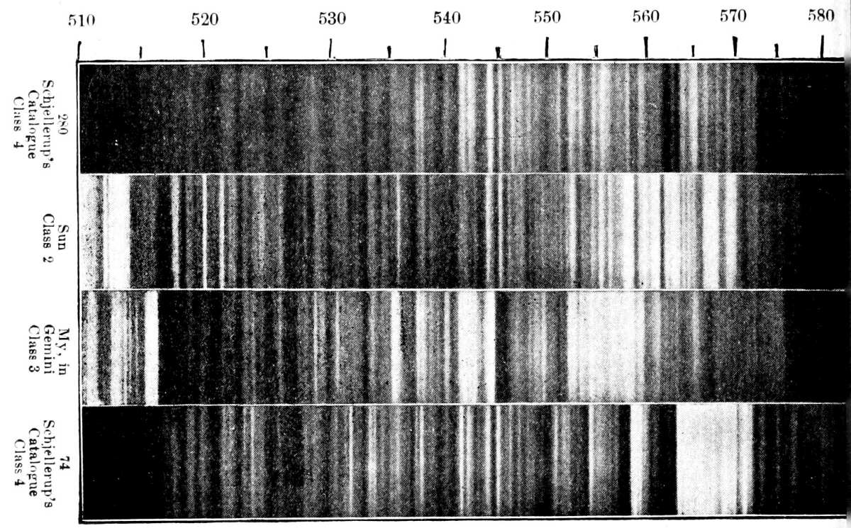 [17] This circumstance indicates that the red color of these stars, as we have already remarked with regard to Mira Ceti, is not to be traced back to a low temperature, but rather to the dust surrounding them. The most extraordinary brightness of some stars, like Arcturus and Betelgeuse, which are redder than the sun, and whose spectra, according to Hale, resemble those of the sun-spots, presuppose a very high temperature. The characteristic lines of their spectra are produced by the relatively cool vapors of their outer portions.