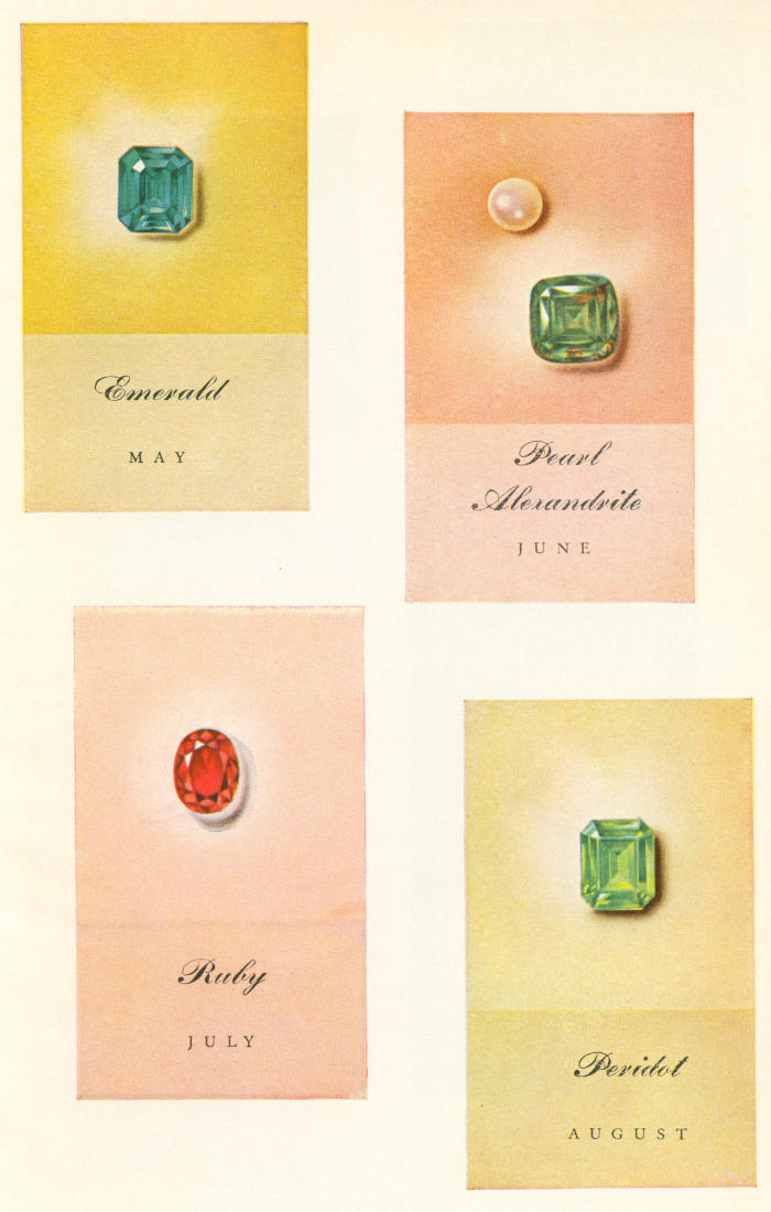 For those with the enthusiasm and the funds, almost an entire alphabet of gem stones can be used. Omitting duplicates, one may run along, to spell one’s message, with amber, bloodstone, carnelian, diamond, emerald, fluorite, garnet, hyacinth, indicolite, jasper, kunzite, lapis lazuli, moonstone, nephrite, opal, pearl, quartz, ruby, sapphire, turquoise, variscite, willemite, zircon. This fashion of conveying one’s sentiments has never grown obsolete and is continually renewed.