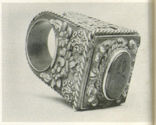 While the 250 odd rings of England’s last King Henry were probably seldom equalled for one person, a more modest but[303] more representative listing was given, in 1649, of the rings of a country lady. She possessed, among other jewels, a toadstone ring, two Turkies (turquoises), six thumb rings, three alderman’s seals, five gemmels and four death’s heads. Always, in every period and every guise, the realm of jewelry has been marked by the reign of the ring.