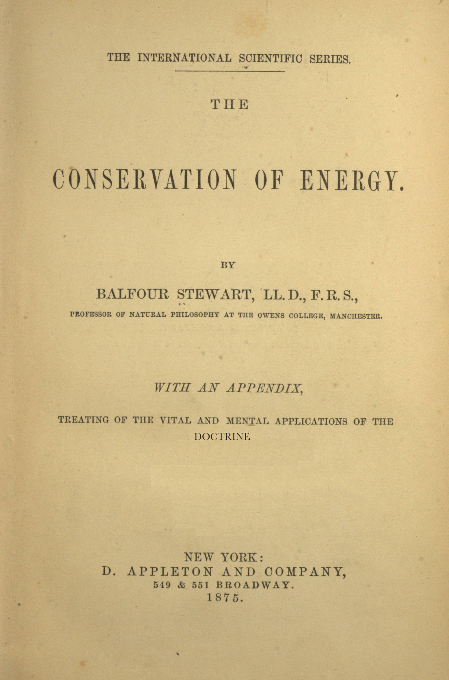 The great prominence which the modern doctrine of the Conservation of Energy or Correlation of Forces has lately assumed in the world of thought, has made a simple and popular explanation of the subject very desirable. The present work of Dr. Balfour Stewart, contributed to the International Scientific Series, fully meets this requirement, as it is probably the clearest and most elementary statement of the question that has yet been attempted. Simple in language, copious and familiar in illustration, and remarkably lucid in the presentation of facts and principles, his little treatise forms just the introduction to the great problem of the interaction of natural forces that is required by general readers. But Professor Stewart having confined himself mainly to the physical aspects of the subject, it was desirable that his views should be supplemented by a statement of the operation of the principle in the spheres of life and mind. An Appendix has, accordingly, been added to the American edition of Dr. Stewart’s[Pg vi] work, in which these applications of the law are considered.