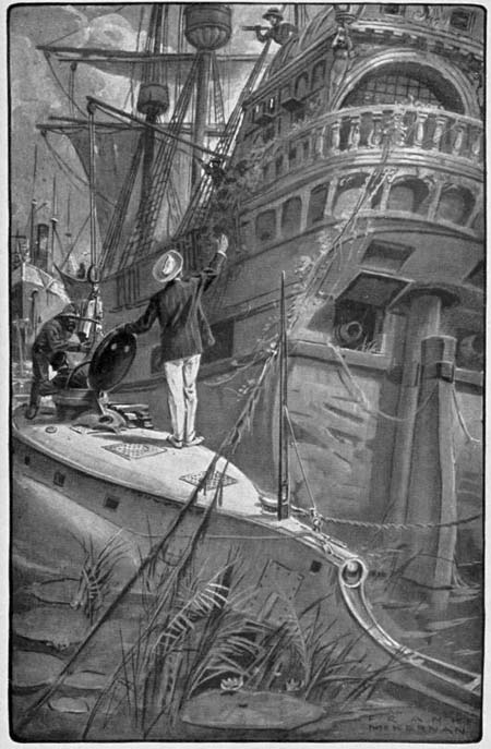 Meanwhile, Lieutenant McCully had turned to Howard and the others, who[258] had now climbed up on the deck. “The Duluth is moving,” he explained. “Captain Morehouse probably intends to come alongside without being asked. Hadn’t you all better get into this boat, and let my men fasten your manhole down? The waves from the Duluth might swamp her, you know.”