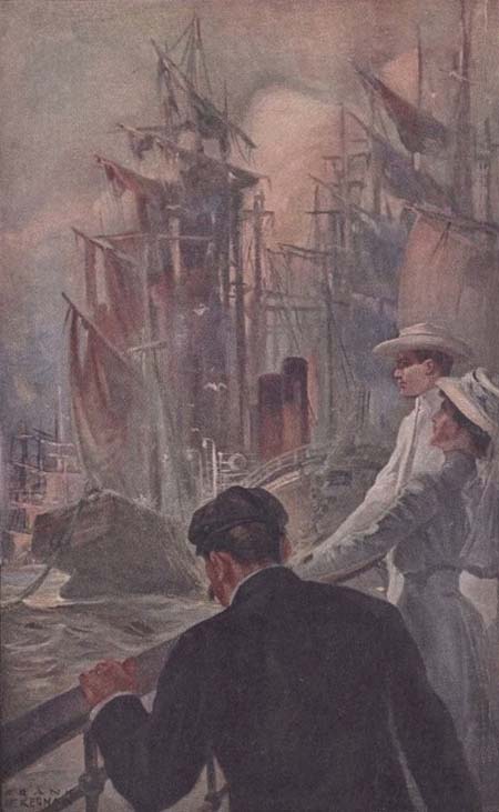 With hands tight gripped on the rail he watched the two men until they disappeared below; then, eager to share his discovery of the ending of a quest that had extended over two continents, he turned and hurried along the deck to[8] where two ladies stood leaning against the taffrail.